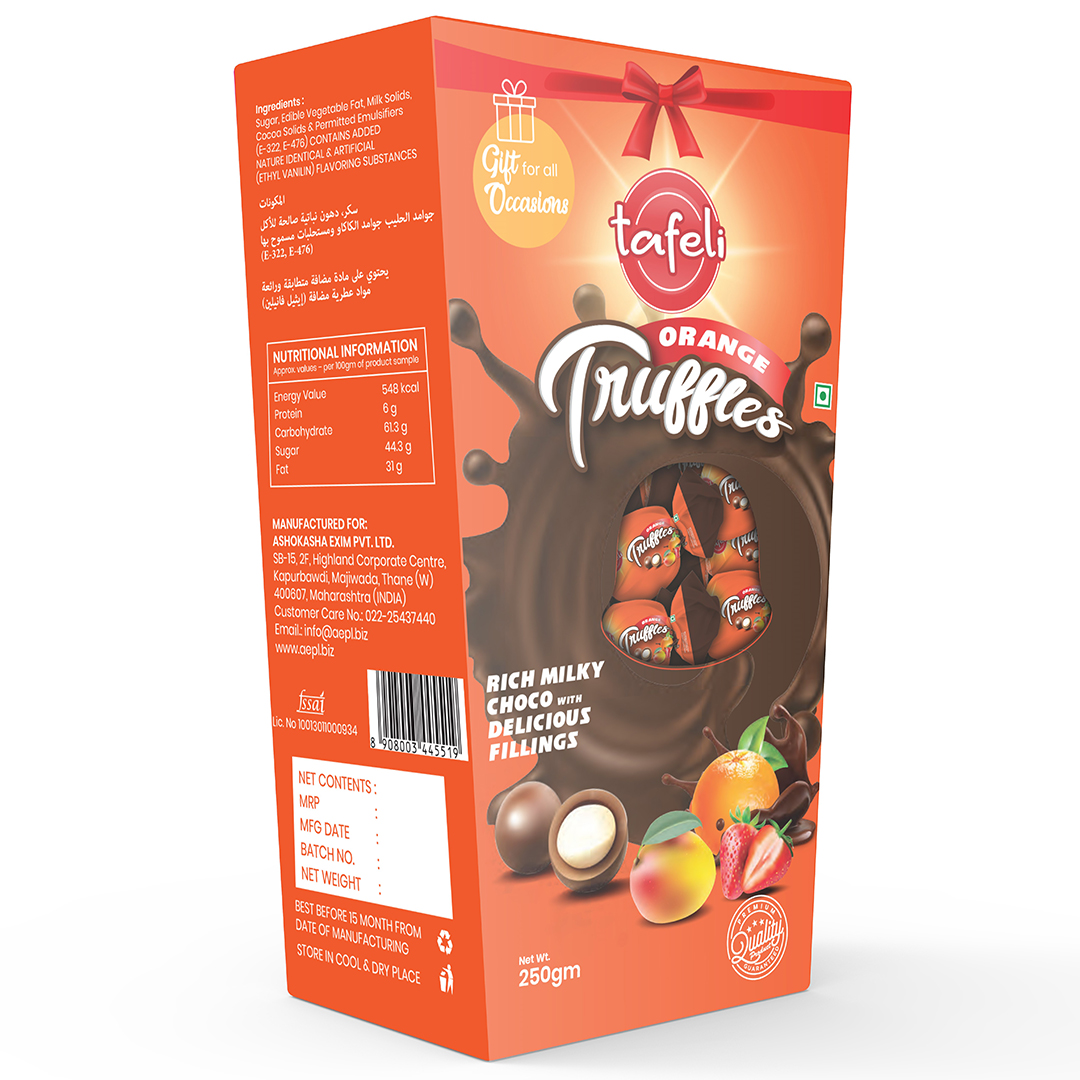 सुन्तला स्वादयुक्त ट्रफल्स प्रिमियम क्वालिटी रिच मिल्की चोको स्वादिष्ट फिलिंगहरू सहित।